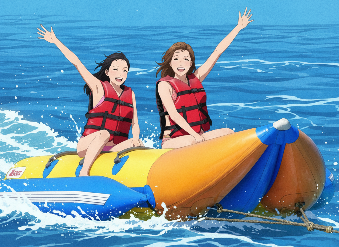 船に引っ張られてバナナボート体験ができます。 体験は2名様より承れます。 ライフジャケット無料レンタル込み 同時に乗ることができる人数5名様まで 1回の体験時間はおよそ10分くらいです。 たくさんで乗り合わせるとお得になります。 スピード調整可能 スリルあげれます(^^♪